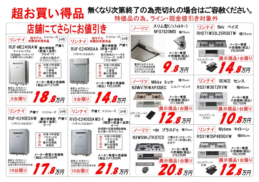 リモコン2台、脚部カバー、工事費、廃材処理費、本体・工事保証10年、消費税込